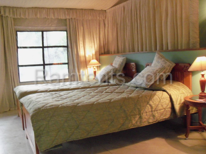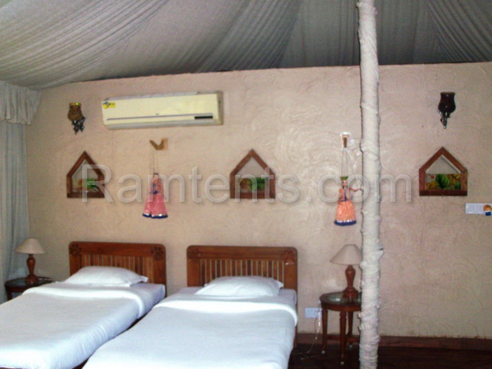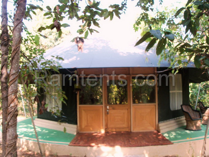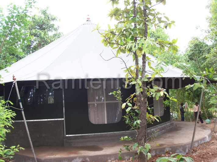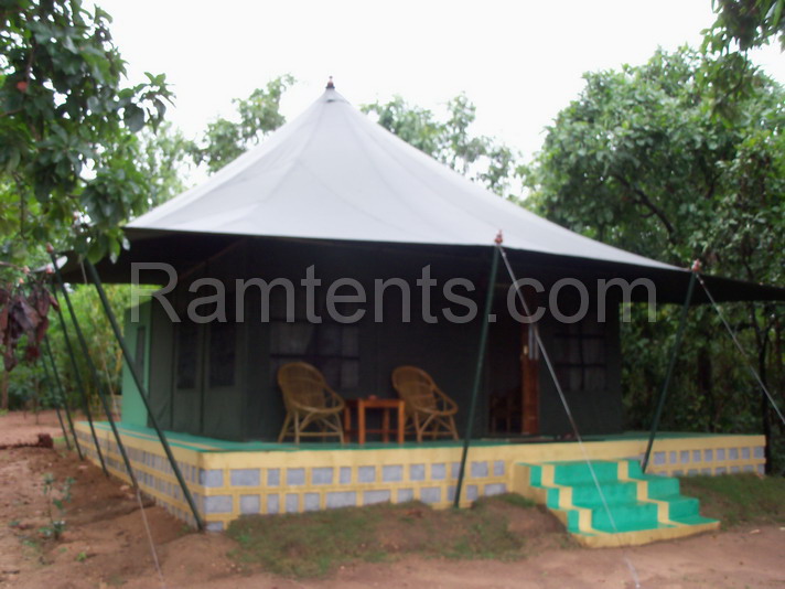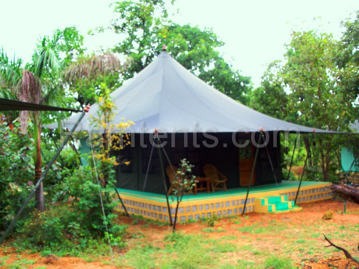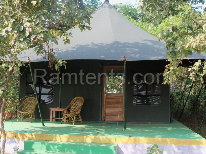 Super deluxe & deluxe models are available to attract the guests towards your resort. It is a single pointed pyramid shaped tent fixed on printed concrete plate form, which has four layers of fabric (UV shade fly, PVC fabric, Polyester Canvas and lastly gorgeous printed fabric). Deluxe safari tents equipped with all the modern facilities like Air Conditioning, a king size bedroom, refrigerator, luxurious bathroom, storage area and sit-out verandah. Tents are spacious and tastefully done up with Neo-ethnic interiors, beautiful furnishing and cozy lighting.