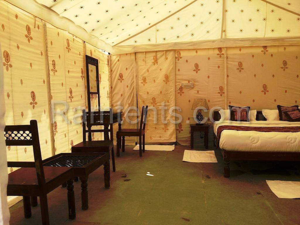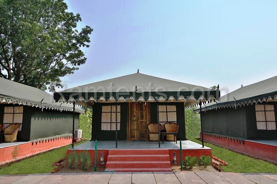 Swiss Cottage Tents made of three high quality fabric layers including , one main room, attached washroom cum dressing room, added with open or close verandah. These tents having good air ventilation windows with fitted mosquito net and windows rain flaps which protect against austere weather condition like rain, heavy wind. Swiss Cottage Tents completely based over the frame structure on a concrete or wooden platform. We use best quality Fabric (PV, PC, PVC, Gorgeous-cotton, silk interior etc.) depends upon the weather condition of area or as per our client's requirement.
