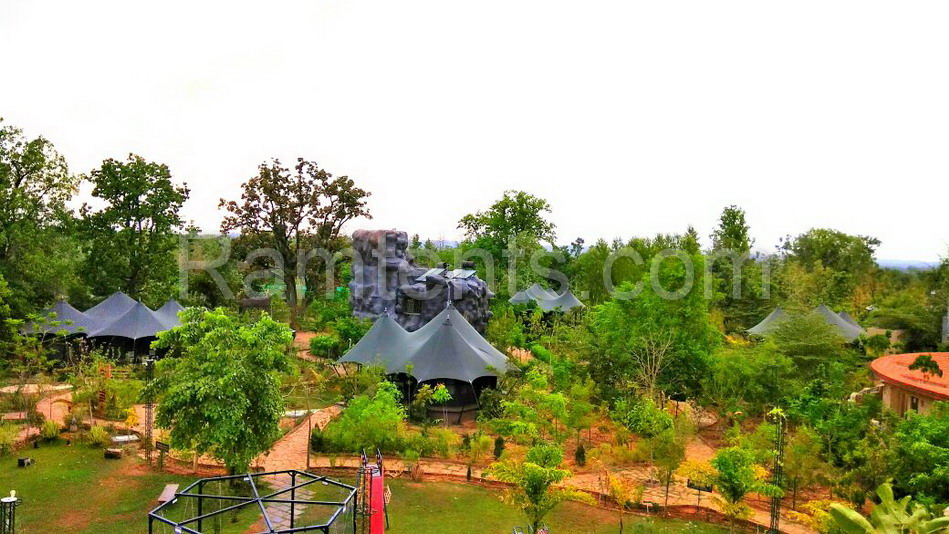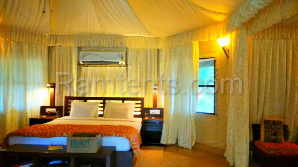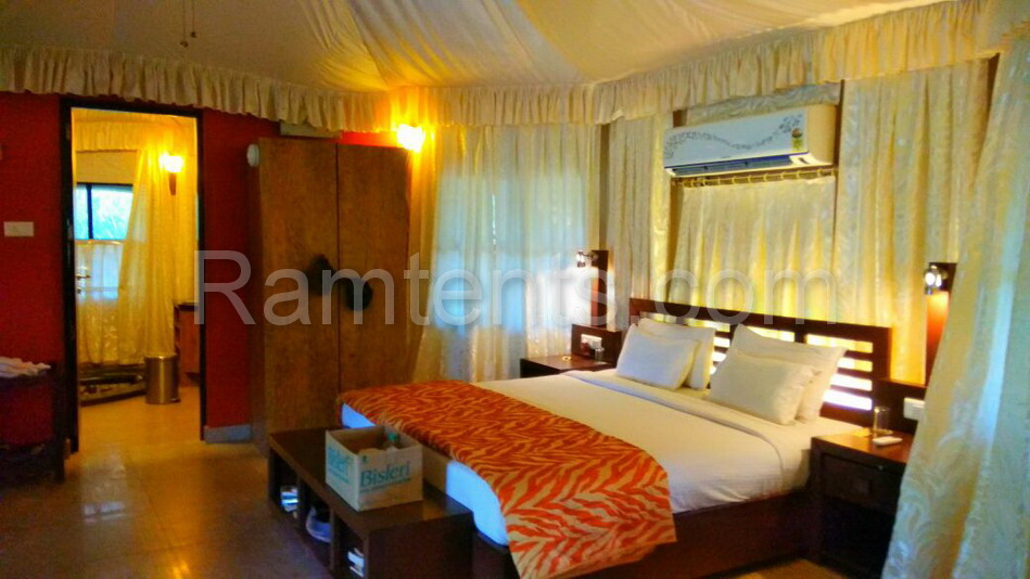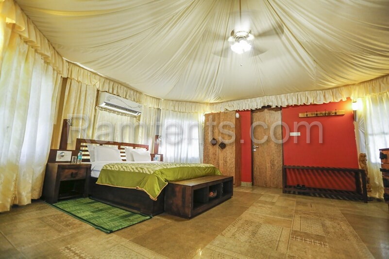 Fairly large, with over 10,000 sq. ft. of private area outside the tent itself, it has a lawn, a bon-fire platform and a swing, making it more luxurious. They are not make-believe ones but actually made of canvas, except for one internal bathroom wall.